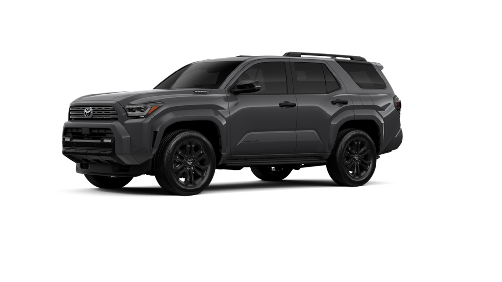 - Dark-chrome tri-bar grille; gloss-black mirror caps and door handles; color-keyed overfenders and rear spoiler; gloss-black "platinum" and "4runner" badges.